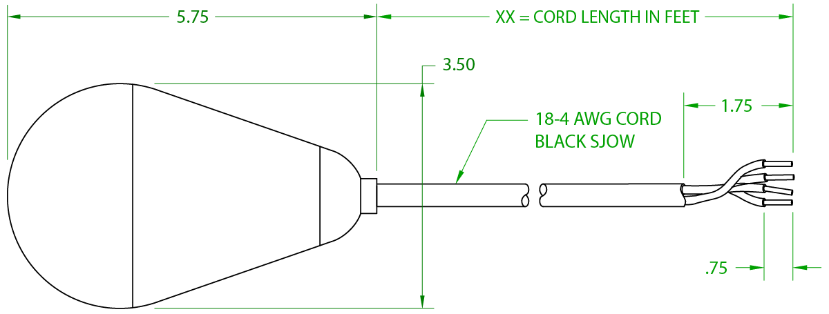 This float has skived ends, where the insulated wire leads inside the cable are intended to be wired into other system components inside a junction box.