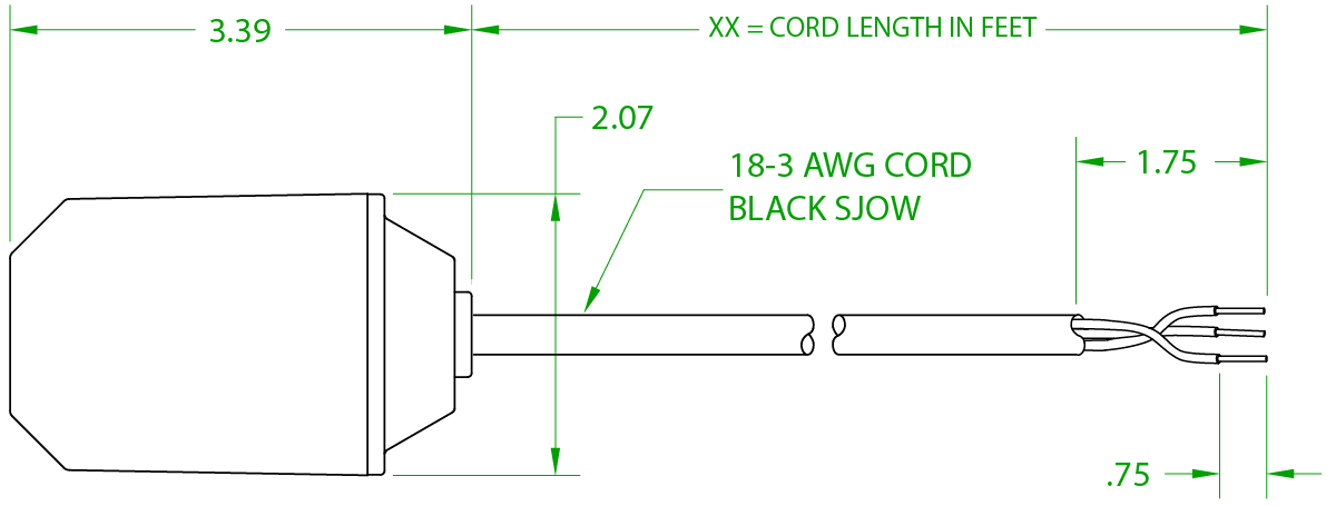 This float has skived ends, where the insulated wire leads inside the cable are intended to be wired into other system components inside a junction box.